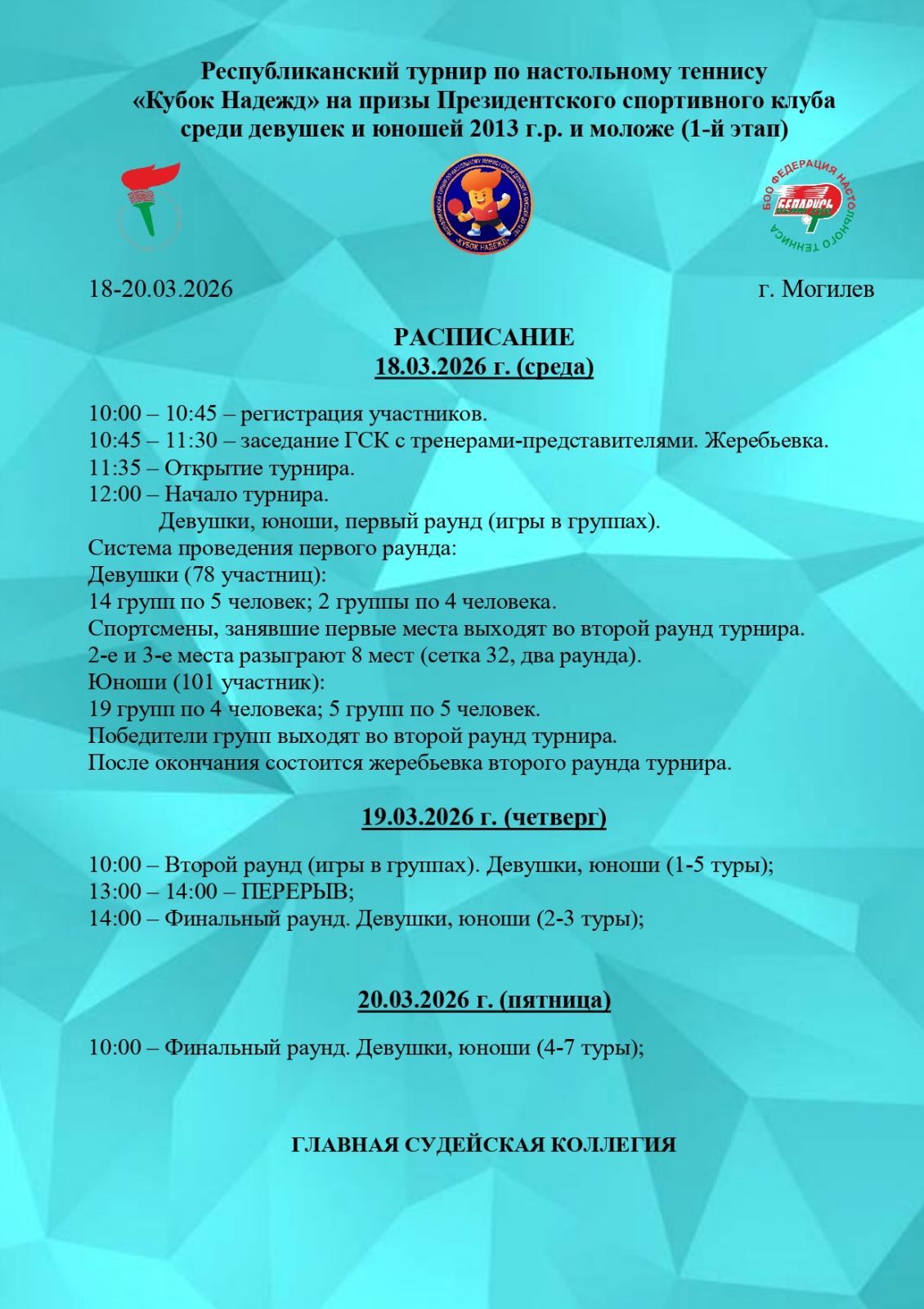 🏓С 18 по 20 марта в Могилёве на базе учреждения «Могилевский областной центр олимпийской подготовки по легкой атлетике и игровым видам спорта» (СК «Олимпиец») пройдет 1-й этап республиканского турнира по настольному теннису «Кубок Надежд» на призы🏆 Президентского спортивного клуба среди девушек и юношей 2013 года рождения и моложе.